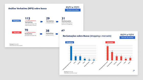 Análise dos verbatims e reclamações associadas ao NPS para identificar padrões recorrentes de insatisfação, expectativas não atendidas e principais pontos de fricção na experiência de busca, considerando os contextos de shopping e mercado.