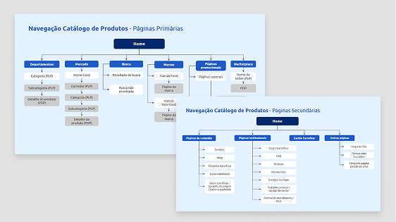 Mapeei e estruturei as principais páginas do ecossistema de navegação do e-commerce — incluindo áreas institucionais e comerciais que antecedem o carrinho de compras — por meio da criação de fluxos e sitemaps. Esse trabalho permitiu visualizar a profundidade, hierarquia e relações entre páginas, servindo como base para decisões de arquitetura de informação, organização do catálogo e consistência da experiência ao longo da jornada de compra.