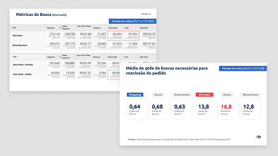 Os estudos em produção permitiram analisar indicadores diretamente ligados à eficiência da jornada de compra, especialmente nos fluxos de busca e descoberta de produtos. Métricas como a média de buscas necessárias para conclusão do pedido, taxas de rejeição e saída em páginas de resultado, além da quantidade média de itens adicionados ao carrinho, evidenciaram fricções estruturais na experiência. Esses indicadores reforçaram a necessidade de evoluir a navegação, a busca e a separação entre food e non-food, atuando em pontos do funil historicamente associados a abandono e queda de conversão no e-commerce. - Diagnóstico profundo e orientado a dados