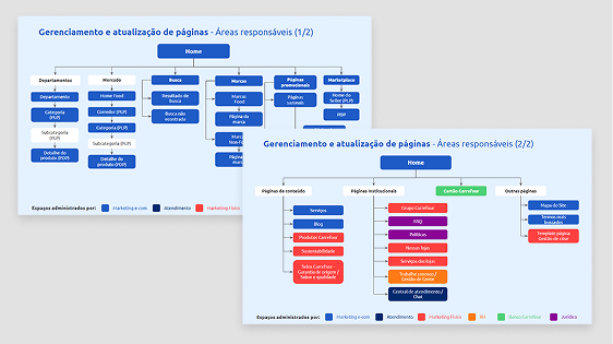 Mapeei e defini, junto às diferentes áreas do Carrefour, as responsabilidades relacionadas ao redesign, à manutenção e à atualização das páginas após a migração de plataforma. Esse trabalho envolveu a articulação entre times como Marketing, RH, Banco Carrefour, Parcerias, SEO, Atendimento e Jurídico, garantindo clareza sobre papéis, fluxos de decisão e ownership. Esse alinhamento foi essencial para viabilizar a evolução do site, reduzir retrabalho e permitir que as etapas do processo avançassem de forma coordenada ao longo do redesenho.