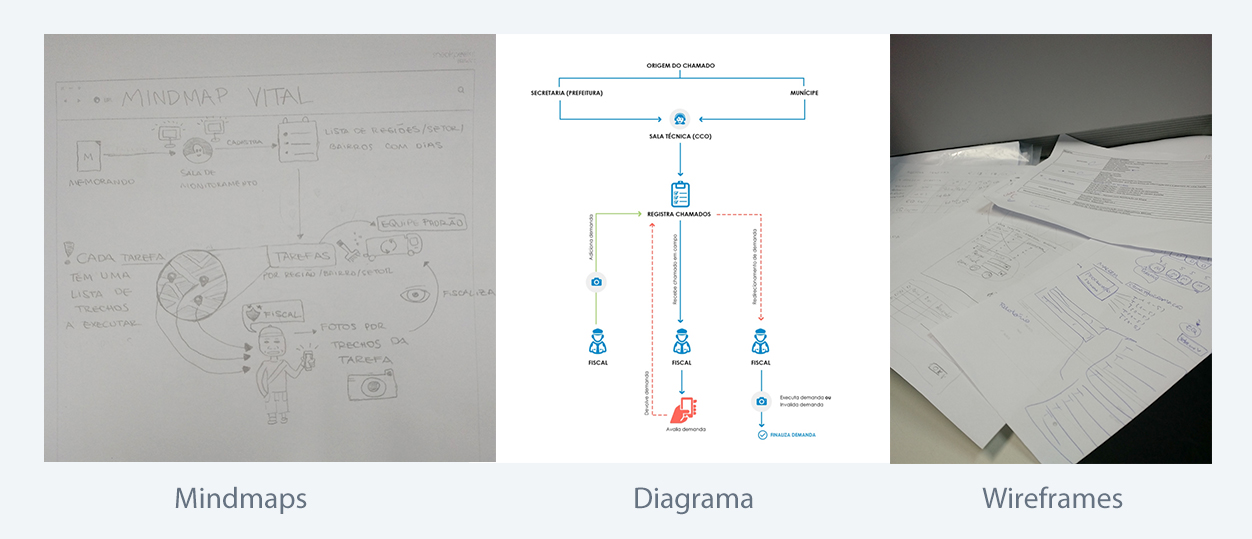Já na fase de síntese e ideação, mindmaps, wireframes e diagramas foram criados para testar ideias colaborativamente.