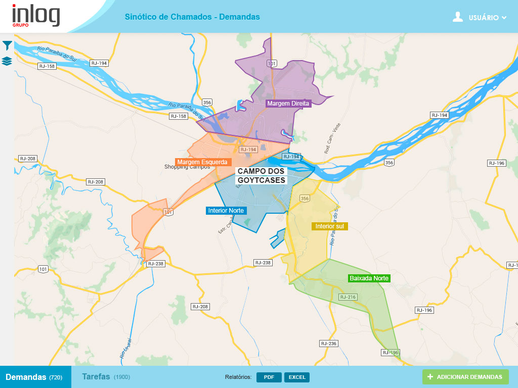Mapas e camadas de visualização, que permitem o centro operacional identificar claramente a região de atuação de cada fiscal.